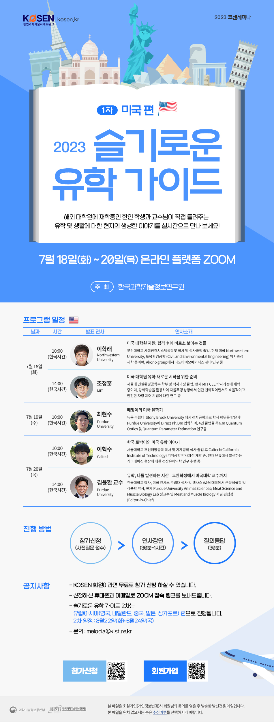 1. 한국과학기술정보연구원(KISTI)에서 한인과학기술자네트워크(KOSEN, www.kosen.kr) 운영의 일환으로 해외 유학을 계획하는 학부생 및 대학원생을 위한 슬기로운 유학 가이드 세미나를 개최한다 하여 안내해드립니다.