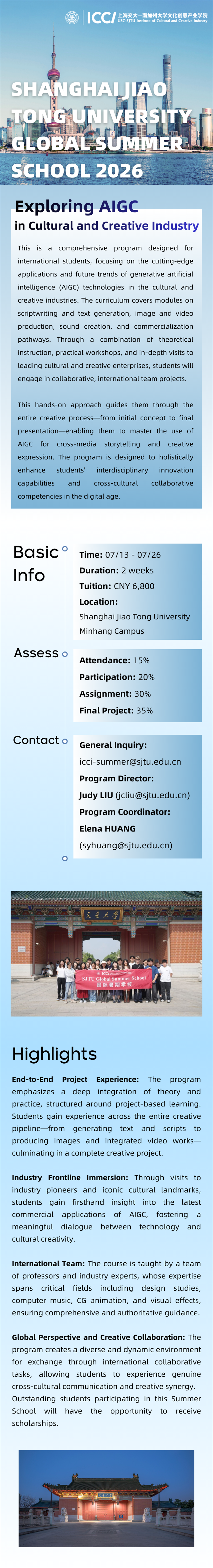 This is an interdisciplinary course designed for the enrolled undergraduate and graduate from overseas institutions, focusing on the multimodal applications of generative artificial intelligence (AIGC) through text/image/video generation modules and visits to leading enterprises. Students are expected to complete full-cycle projects from concept to presentation, and enhance their cross-cultural collaborative competencies in the digital age.
