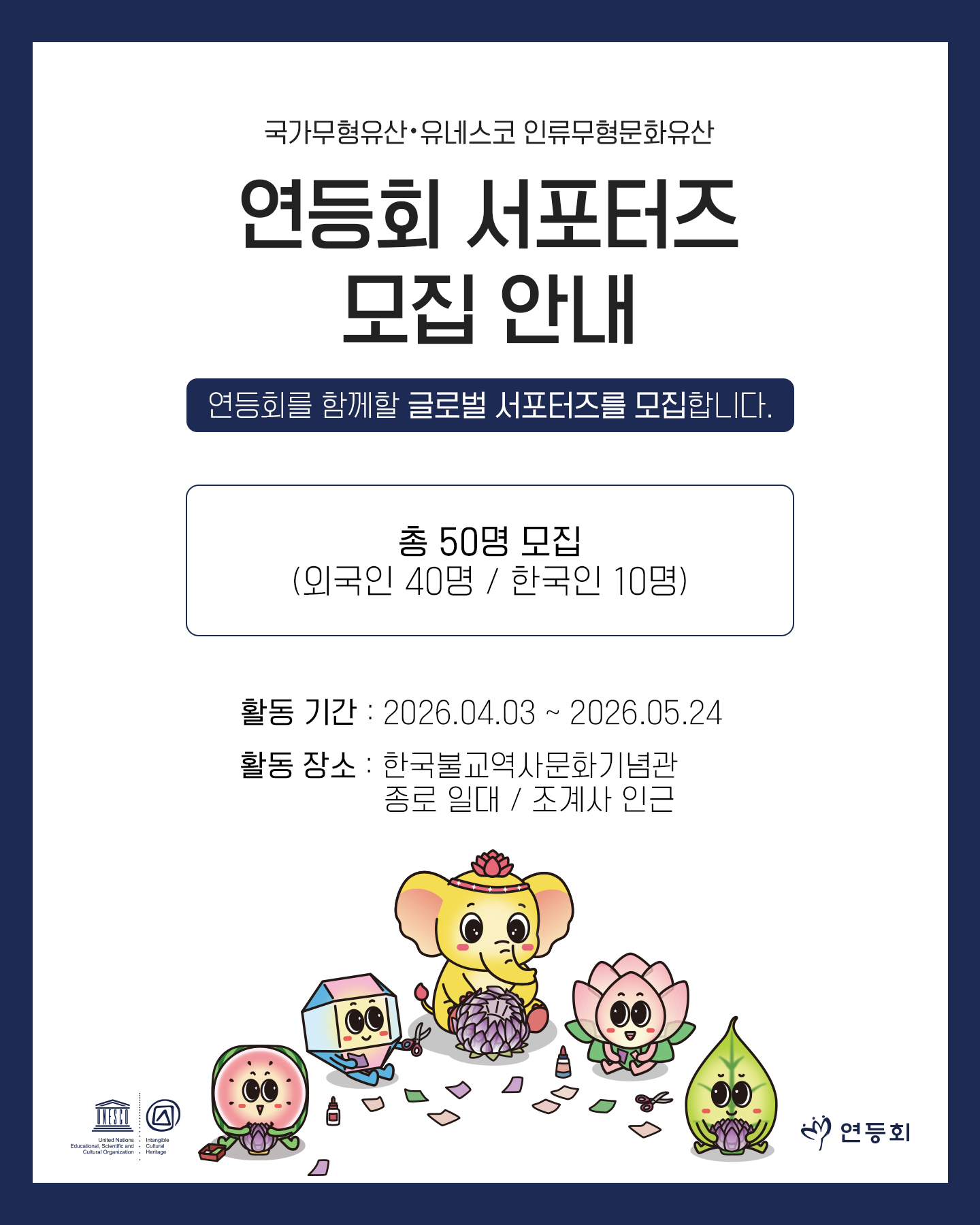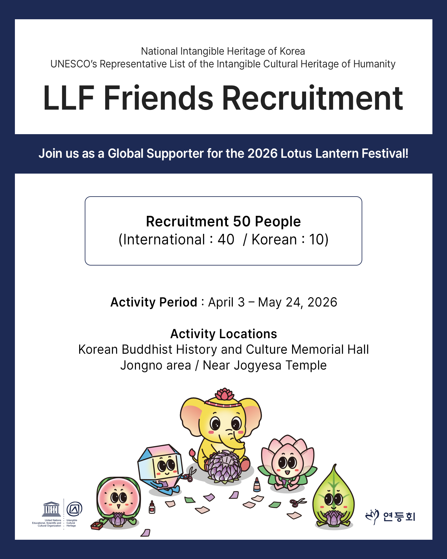 We are recruiting 2026 LLF Friends (Lotus Lantern Festival Friends) to help promote the Lotus Lantern Festival, which is inscribed on UNESCO’s Representative List of the Intangible Cultural Heritage of Humanity and designated as a National Intangible Heritage of Korea.