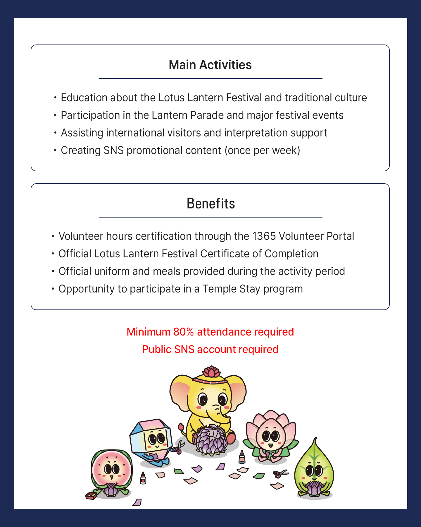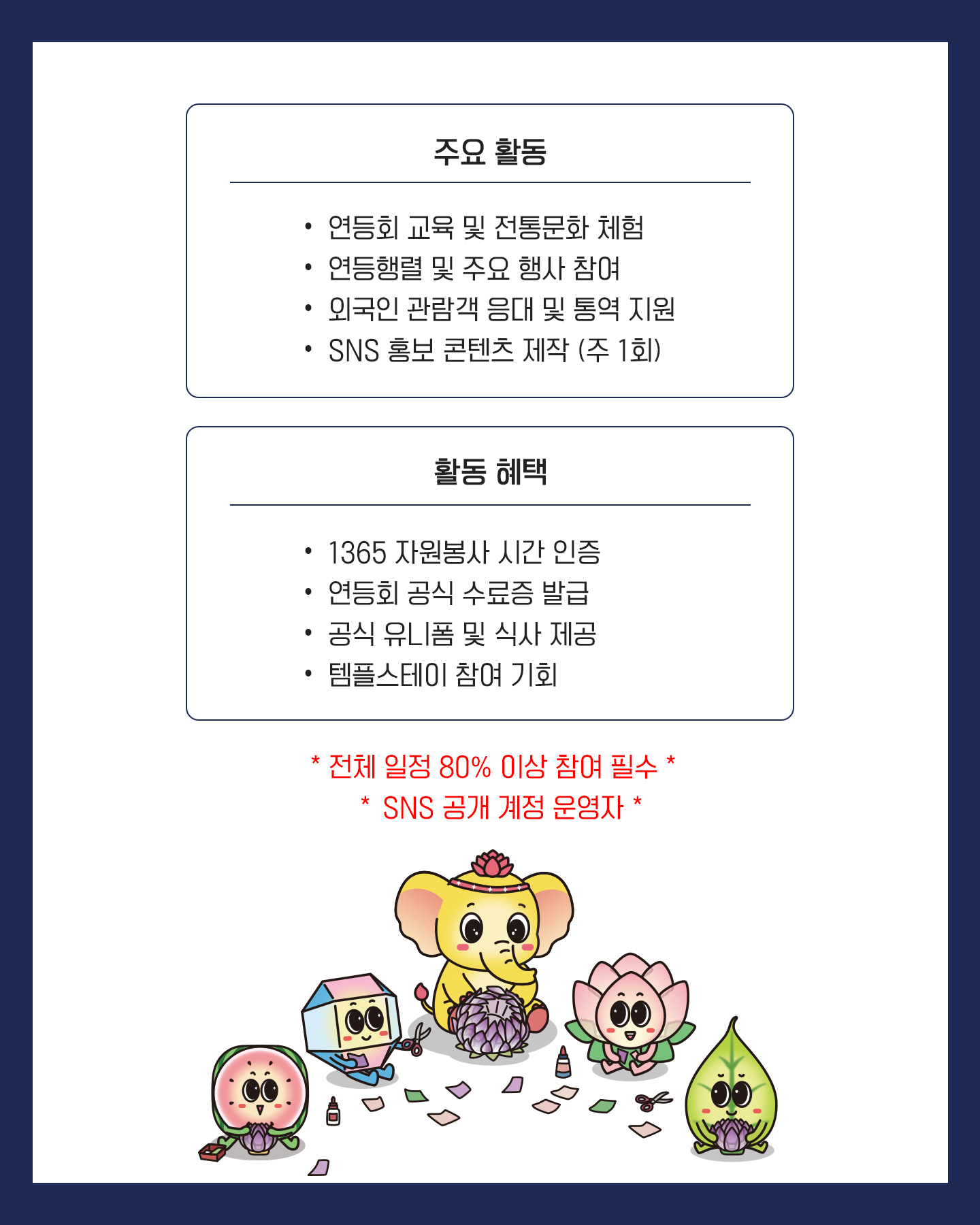 • 전체 일정의 80% 이상 출석 (발대식/템플스테이/연등회 DAY1,2/해단식 필수 참여)